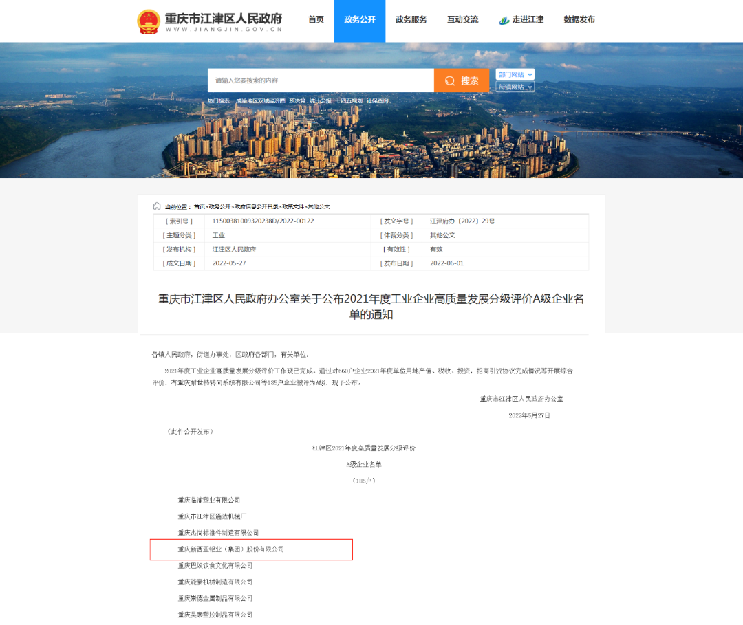 重慶新西亞鋁業(集團)榮獲“2021年度工業企業高質量發展分級評價A級企業”。