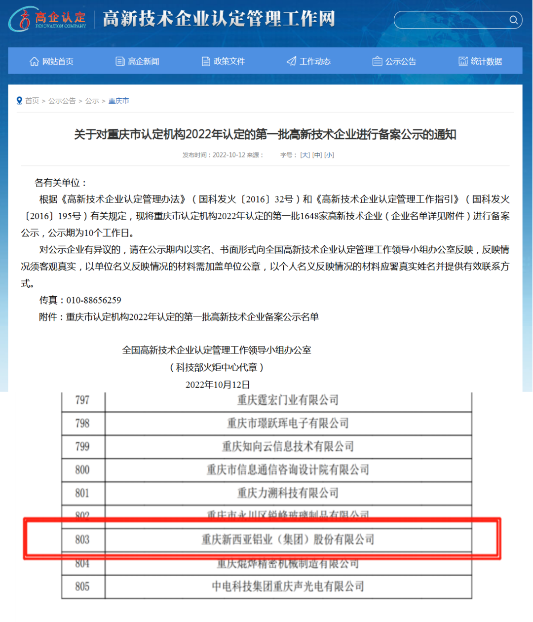 2022年10月12日,根據《高新技術企業認定管理辦法》(國科發火〔2016〕32號)和《高新技術企業認定管理工作指引》(國科發火〔2016〕195號)有關規定,高新技術企業認定管理工作網對2022年度重慶市第一批擬認定高新技術企業名單進行了公示,我司喜在榜中。這是新西亞鋁業獲得由國家科技部審核復審認定的“高新技術企業”稱號。