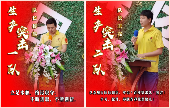“生產突擊一隊”隊長傅熊同志作為7支隊伍代表向大家發出倡議,號召全體突擊隊隊員甘于奉獻、愛崗敬業、加強學習,以更加飽滿的熱情、以主人翁的心態積極投身于公司生產經營工作中,真抓實干,用出色的成績回報公司。