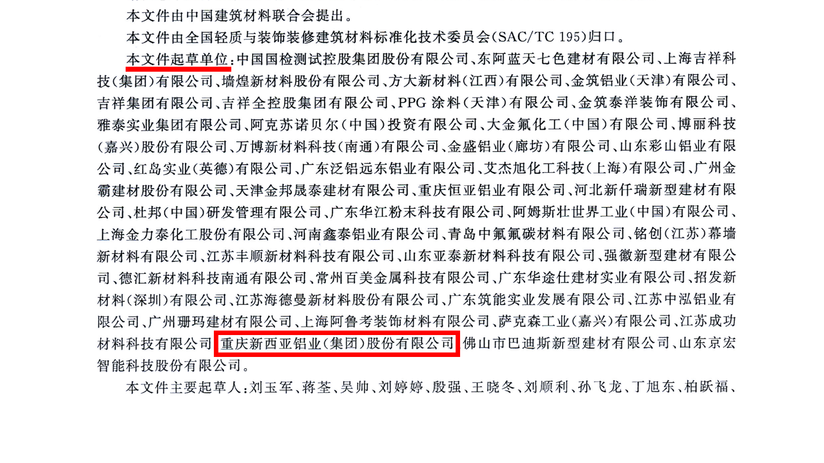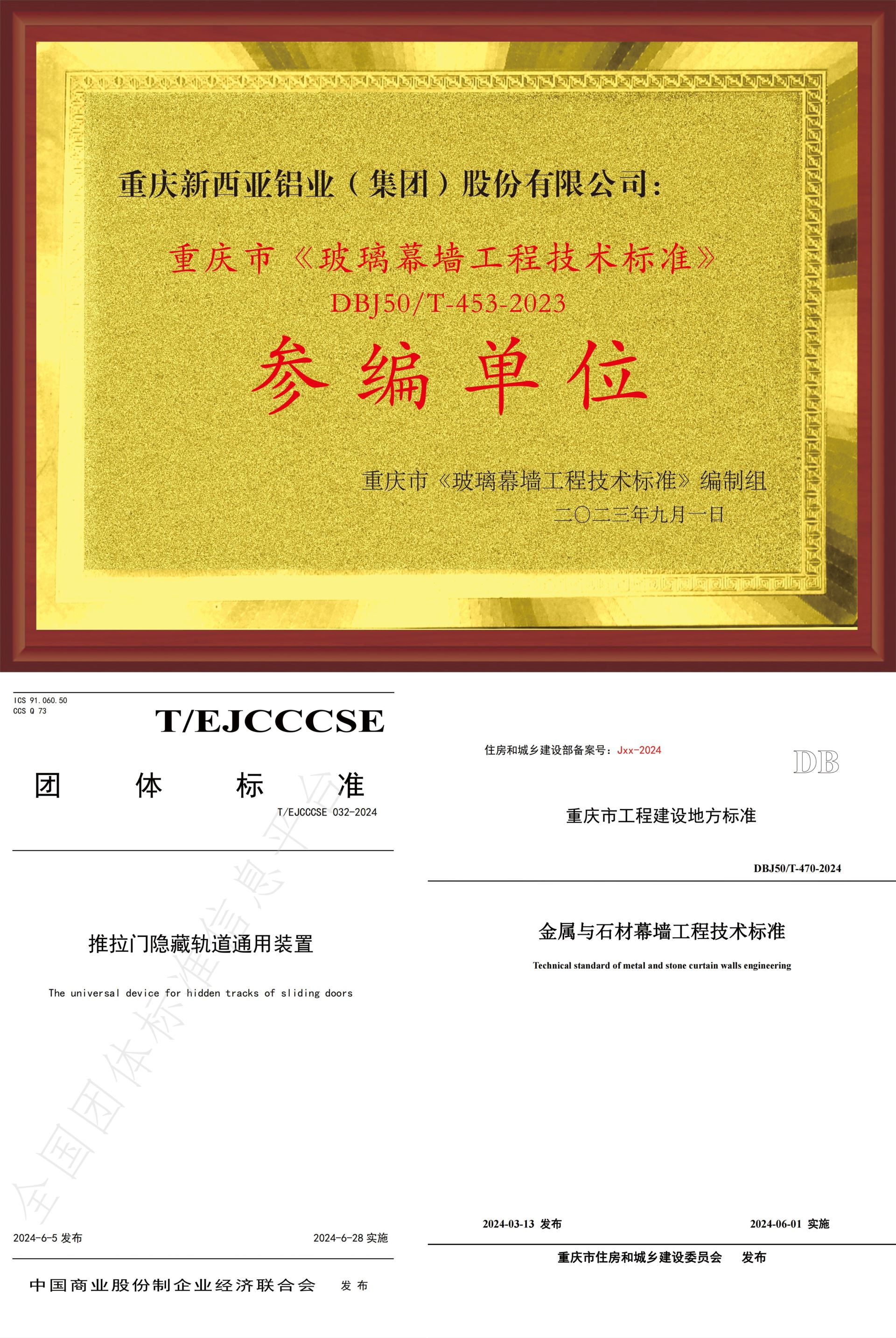 除本次參與的兩項國家標準外,集團公司還先后參與了《建筑隔熱屋面環境耐久性評價》JC/T 2754-2023、《重慶市金屬與石材幕墻工程技術標準》DBJ50/T-470-2024、《重慶市玻璃幕墻工程技術標準》DBJ50/T-453-2023、《數據質量 第130部分:主數據:特征數據的交換:準確性》GB/T42381.130-2023、《推拉門隱藏軌道通用裝置》T/EJCCCSE 032-2024等多個國家及行業、地方、團體標準的制定,展現了新西亞鋁業在鋁深加工全產業鏈的技術實力和行業影響力。