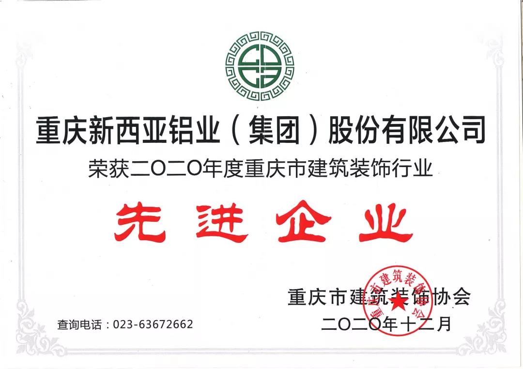 會上,對2020年度重慶市建筑裝飾工程優質獲獎企業、先進企業、優秀個人進行表彰。重慶新西亞鋁業(集團)股份有限公司榮獲2020年度重慶市建筑裝飾行業“先進企業”、總經理劉斌榮獲2020年度重慶市建筑裝飾企業“優秀經理”。