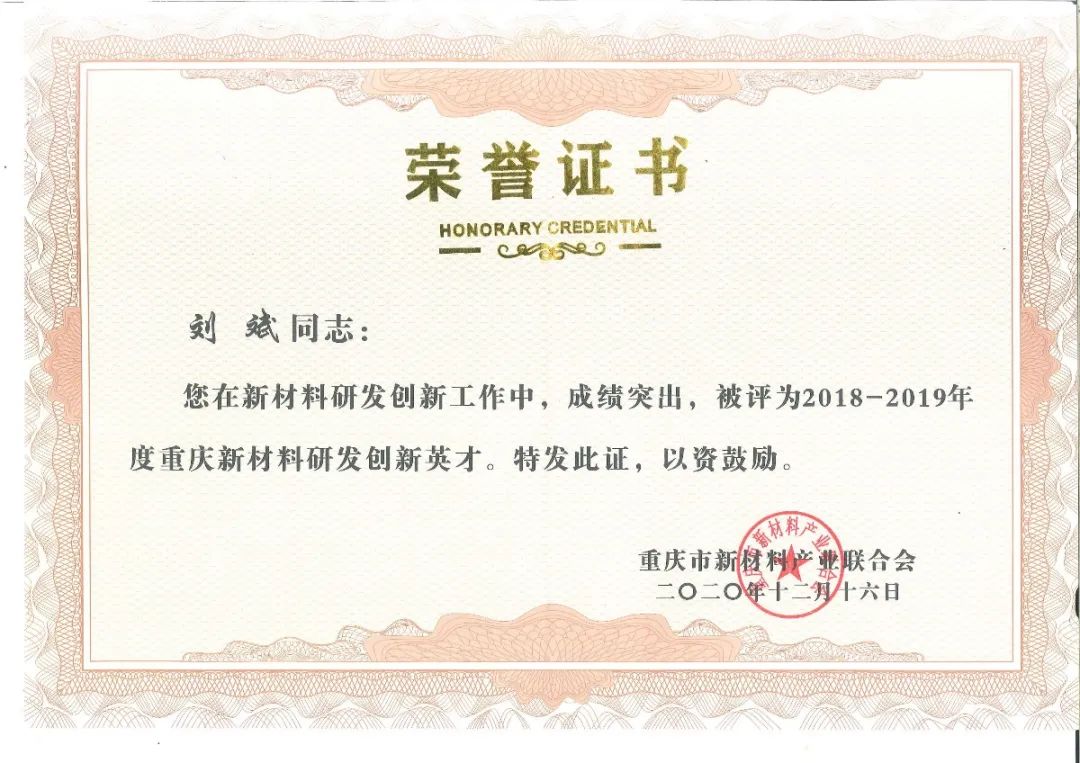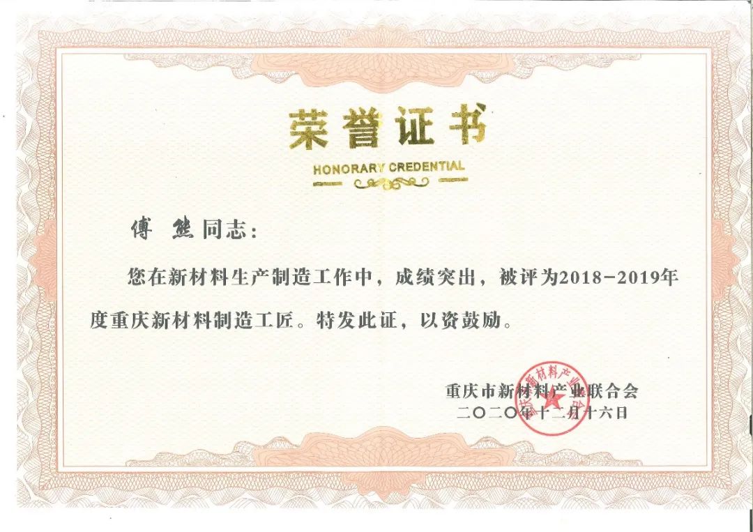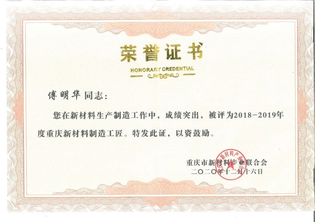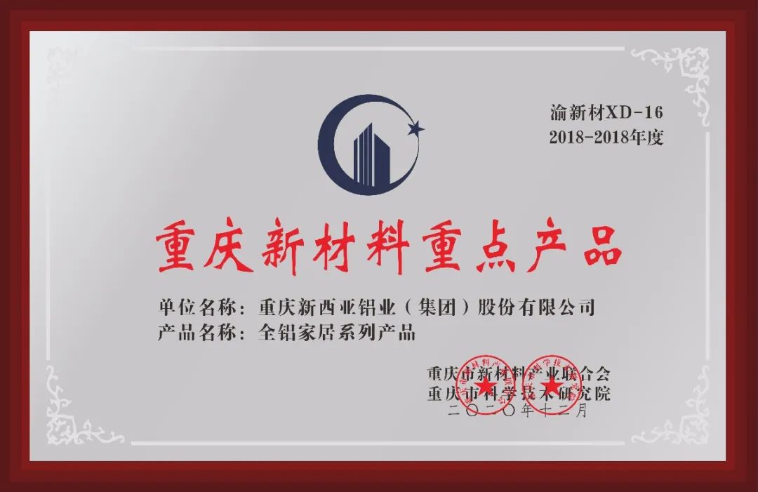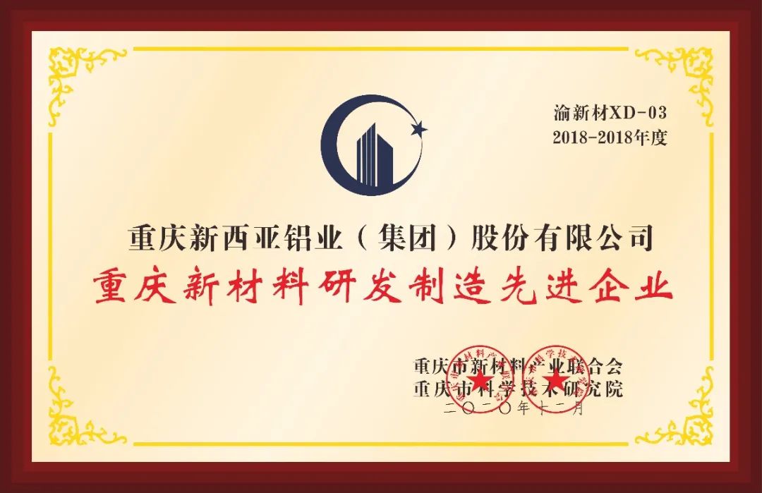 重慶新西亞鋁業集團榮獲2018-2019年度“重慶新材料研發制造先進企業”“重慶新材料重點產品”,集團公司總經理劉斌榮獲“重慶市新材料研發創新英才”,鋁裝飾事業部執行總經理傅明華、生產部主管傅熊榮獲“新材料制造工匠”。