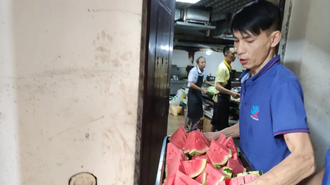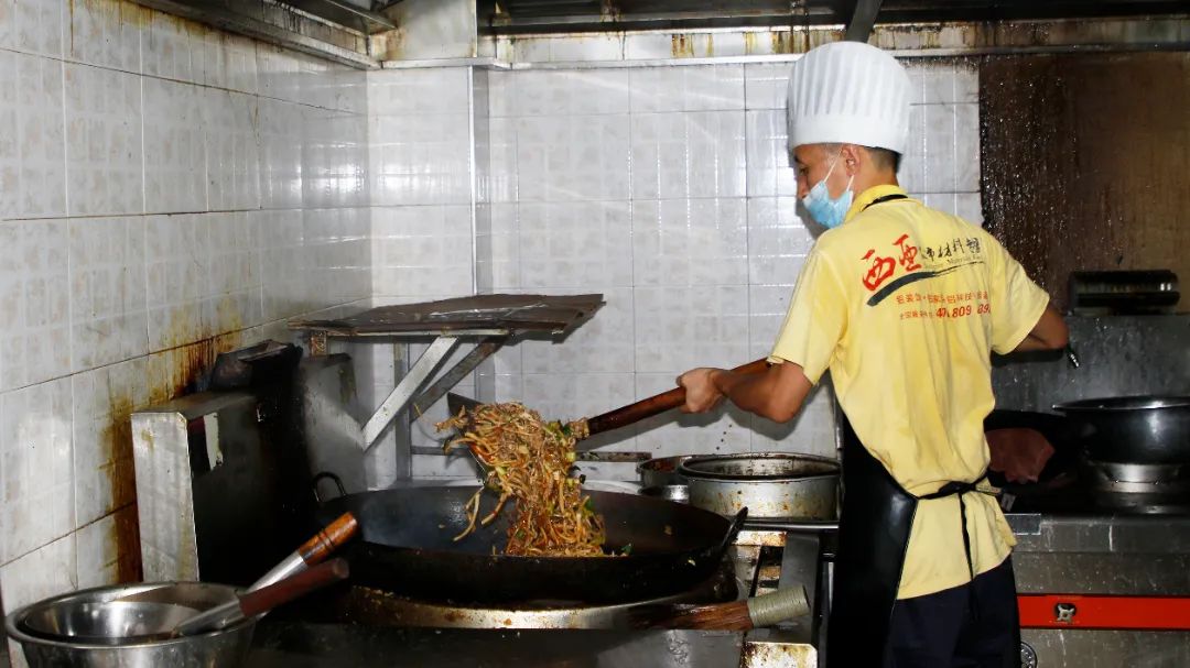 在廚房里靠近火焰的灶臺邊,溫度竟高達50℃!食堂工作人員穿著工作服,戴著口罩,在煙與火的戰(zhàn)場上,用自己的汗水,奏響后廚鍋碟盆勺的交響曲,在高溫爐煉獄中,每日堅持給大家烹飪可口的飯菜。