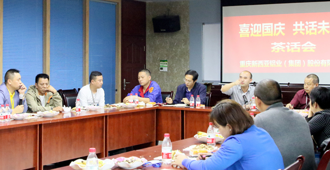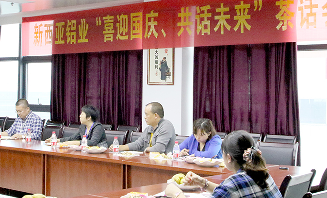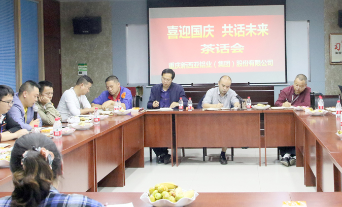 9月30日,重慶西亞鋁業集團公司在三樓會議室舉行了“喜迎國慶,共話未來”茶話會。公司董事長兼總經理劉斌,副總經理傅明華、周雄及各部門負責人、部分主管28人,齊聚一堂,共話新西亞美好未來。
