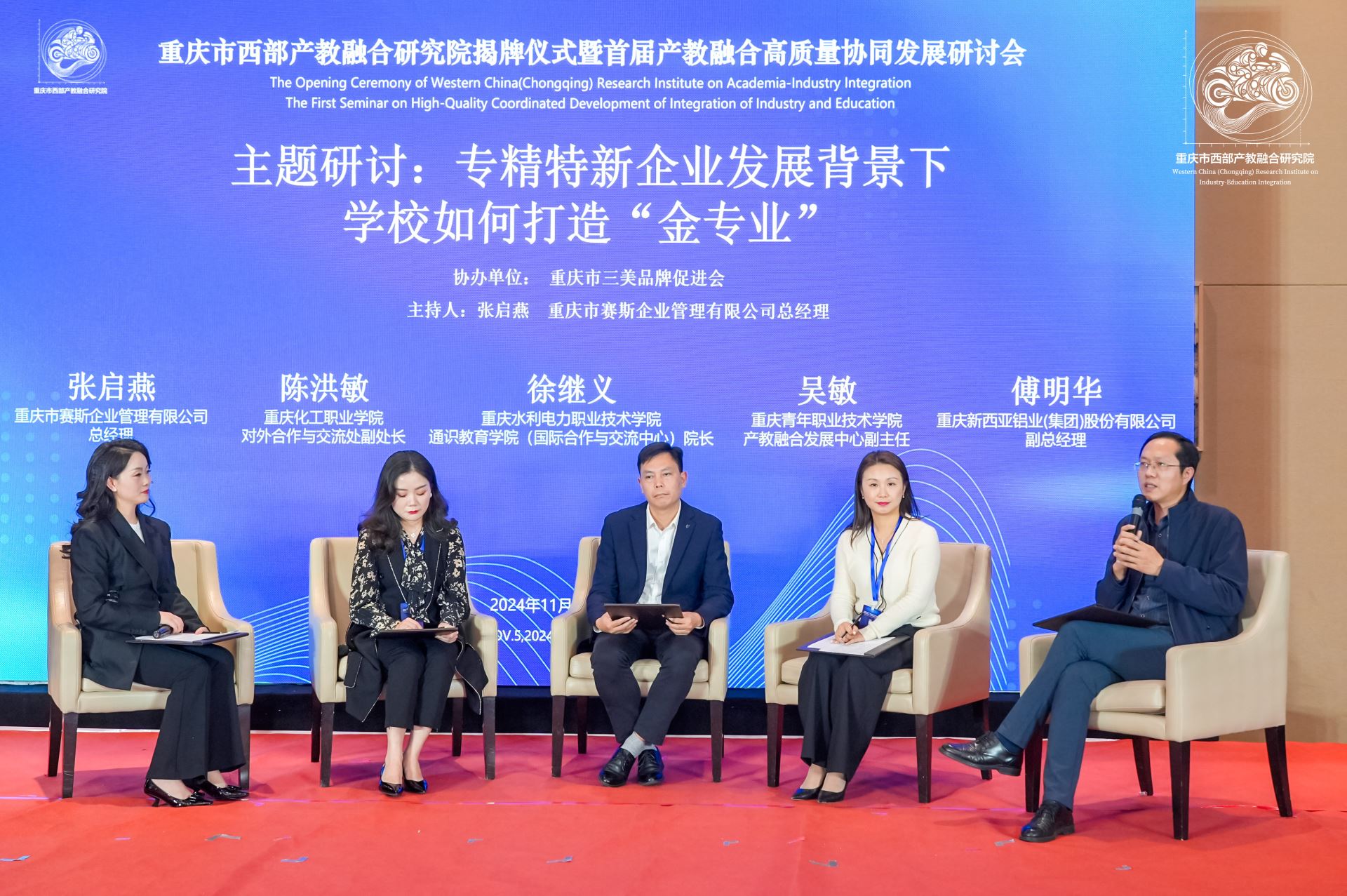 會上,傅明華圍繞企業對人才的新特點和新要求,以及在新“雙高”背景下,專精特新企業如何促進“金專業”建設方面,與重慶化工職業學院對外合作與交流處副處長陳洪敏、重慶水利電力職業技術學院通識教育學院(國際合作與交流中心)院長徐繼義、重慶青年職業技術學院產教融合發展中心副主任吳敏進行了深入探討。