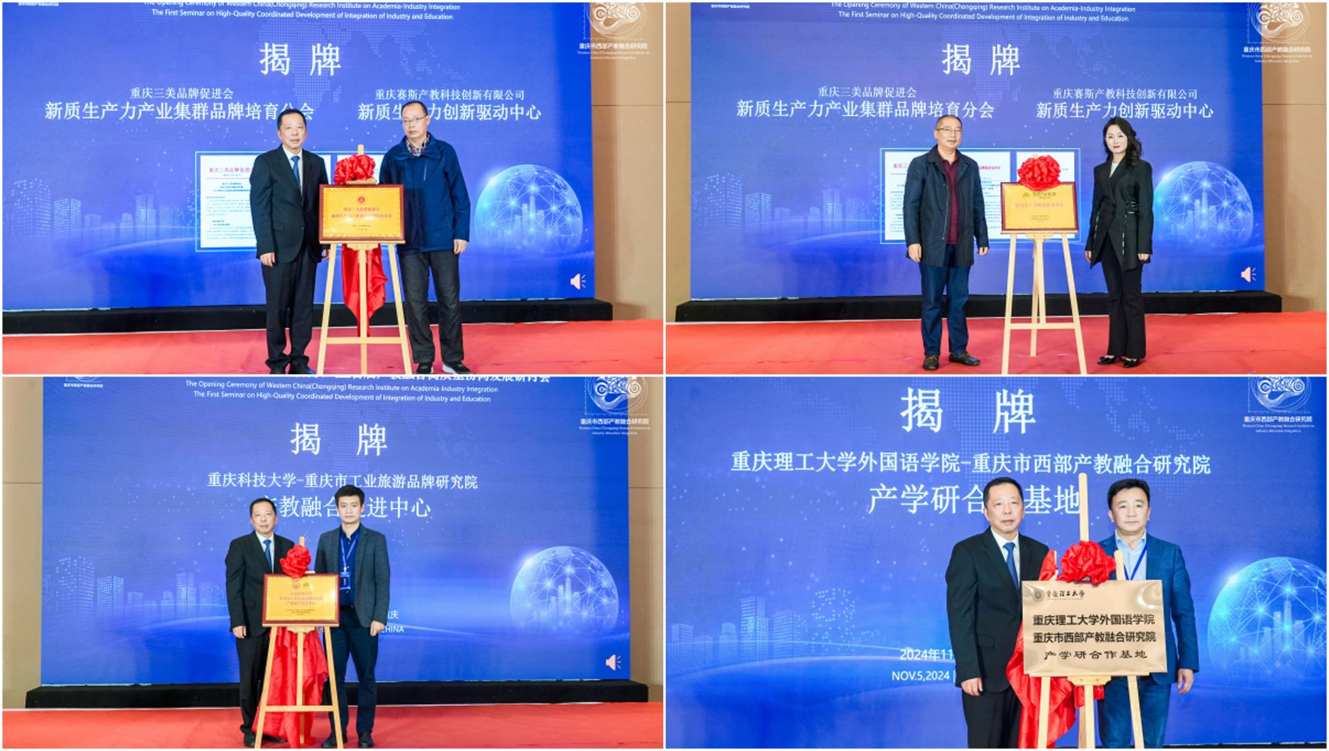 會議中,研究院與重慶三美品牌促進會、重慶賽斯產教科技創新有限公司、重慶科技大學-重慶市工業旅游品牌研究院、重慶理工大學外國語學院等單位舉行了系列揭牌活動,通過系列合作成果的達成,充分發揮了研究院搭建產教融合、科教融匯、協同育人的平臺作用,激活產學研一體化“強”引擎,為校企合作注入“新”動力。
