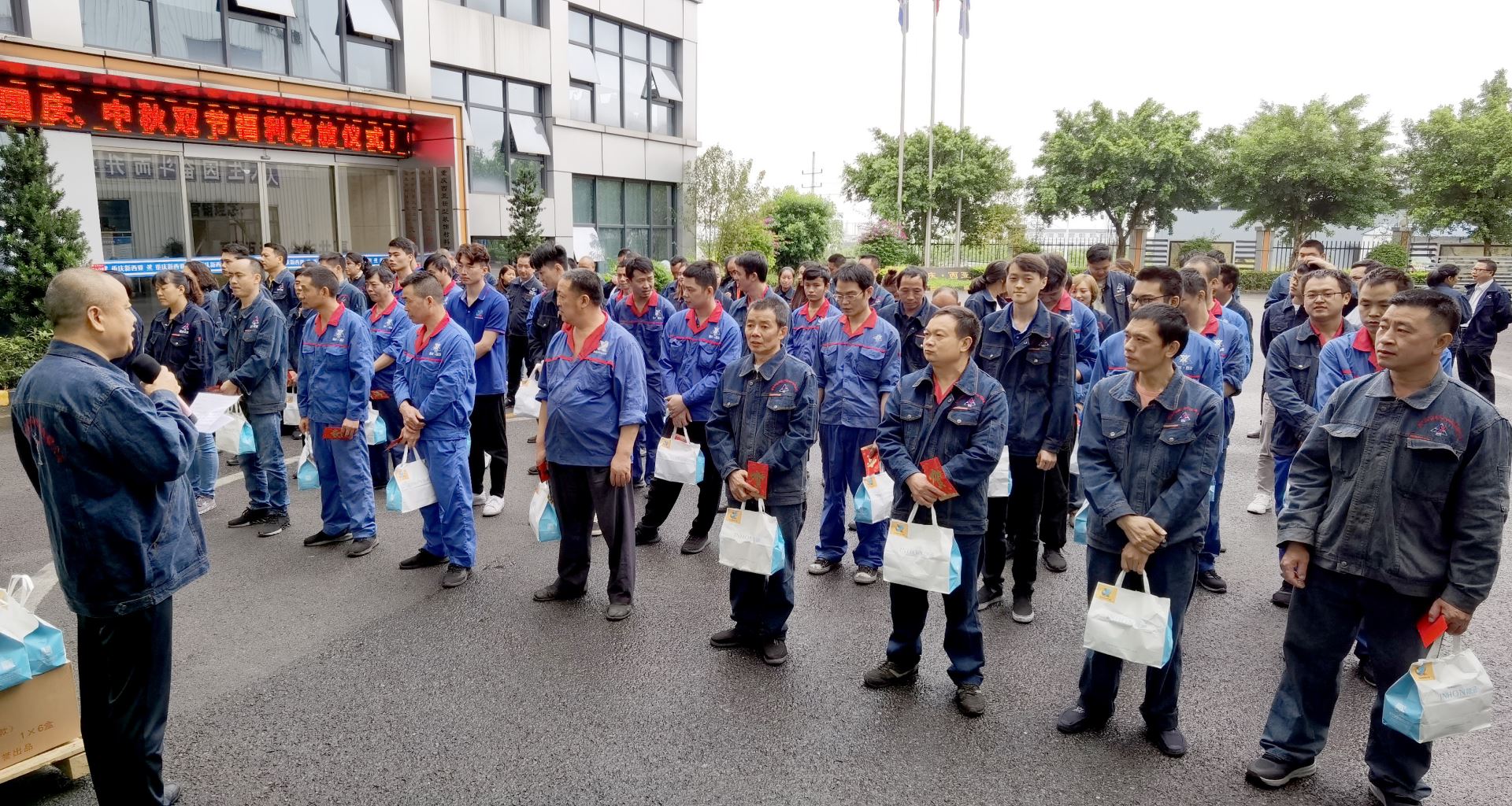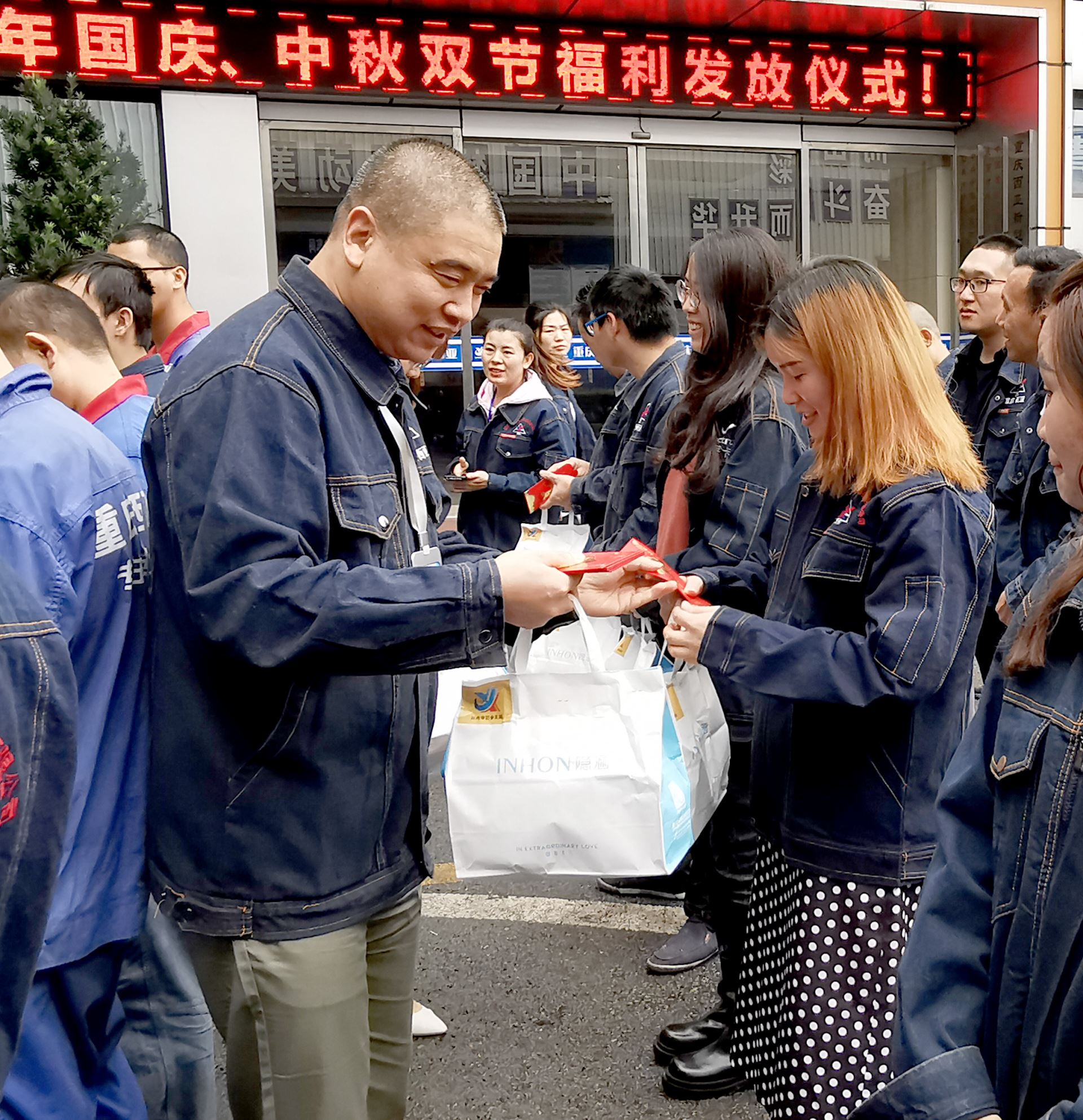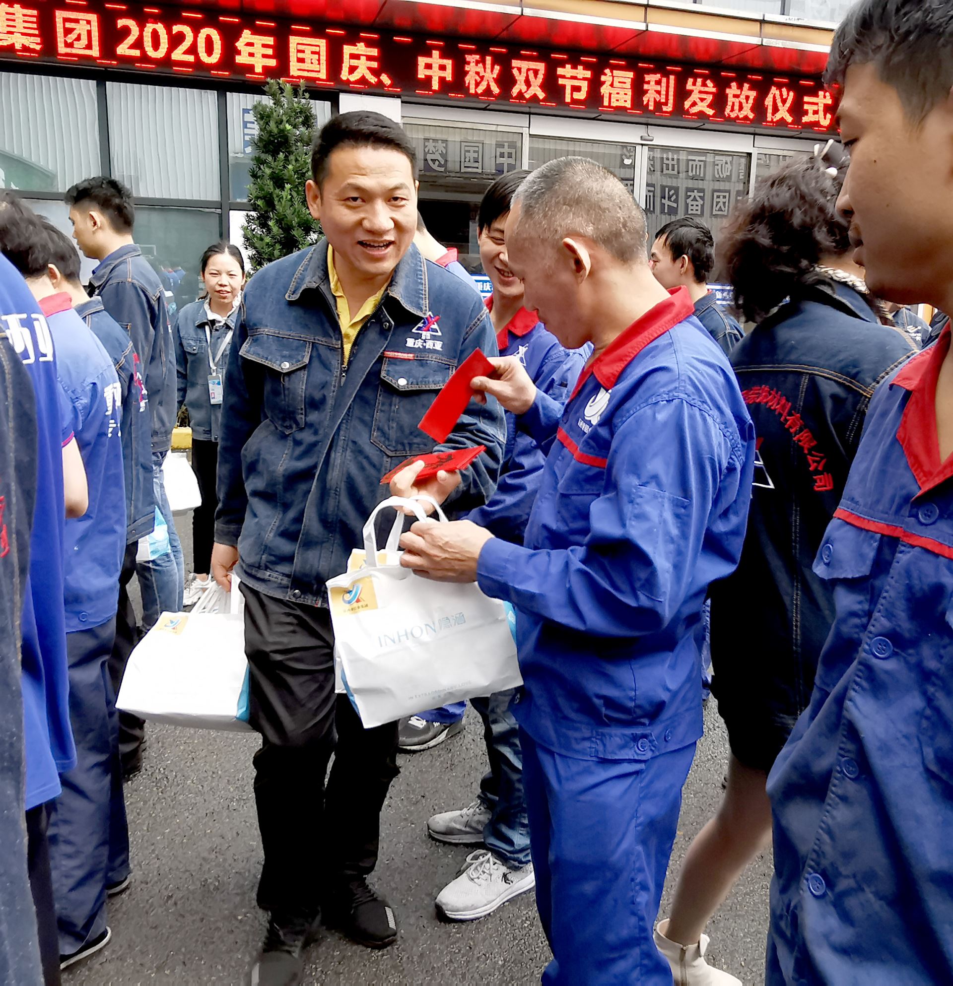 活動現場,經營班子成員將國慶中秋雙節福利禮品和員工家屬慰問金發放到每一位員工手中。